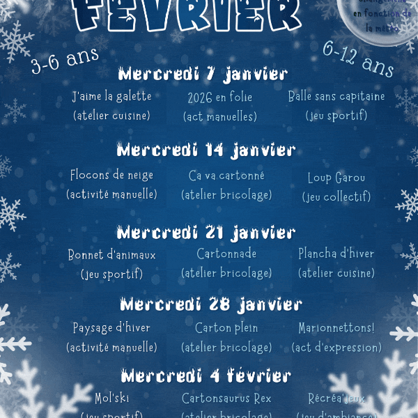Inscriptions Vacances d’Hiver 2026 Les inscriptions ouvriront lundi 19 janvier à 8h00. Les e-mails envoyés avant le 19 janvier 8h00…