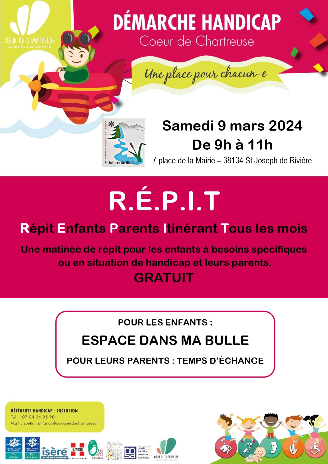 Démarche Handicap 26Fév 202427 Mai 2024 🗓️ Date : 09/03 ⏰ Heures : 9h00-11h00 🏡 Locaux du centre de loisirs Une matinée de répit pour les enfants à besoins spécifiques ou en situation de handicap et leurs parents. Similaire
