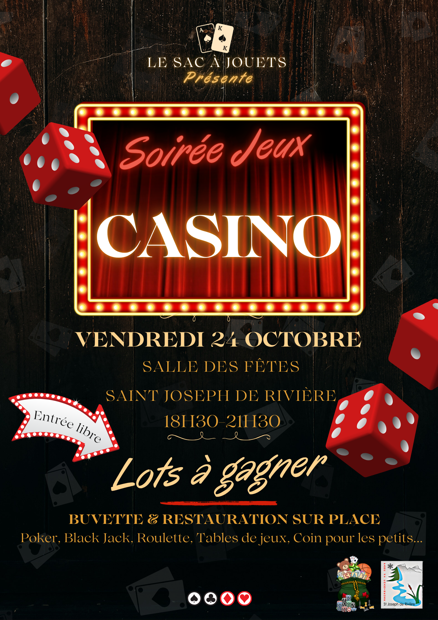 Le Sac à Jouets vous donne rendez-vous pour une soirée inoubliable le vendredi 24 Octobre, de 18h30 à 21h30, sur le thème des jeux de casino. Une occasion parfaite de partager rires et convivialité en famille ou entre amis, avec en prime des lots à gagner pour les plus chanceux !
